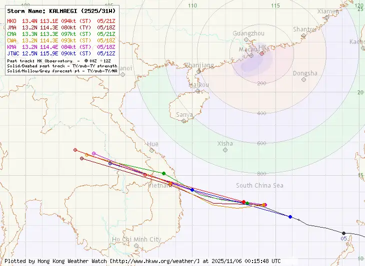 - 04:00 ไต้ฝุ่น “คัลแมกี” Kalmaegi 갈매기 ในทะเลจีนใต้ มีความเร็วลมใกล้ศูนย์กลางเพิ่มขึ้นเป็น 80 น็อต ความกดอากาศ 955 hPa พิกัดล่าสุดอยู่ที่ 13.3°N 113.1°E แนวโน้มขึ้นฝั่งตอนกลางของเวียดนามระหว่างคืนนี้จนถึงเช้าวันพรุ่งนี้