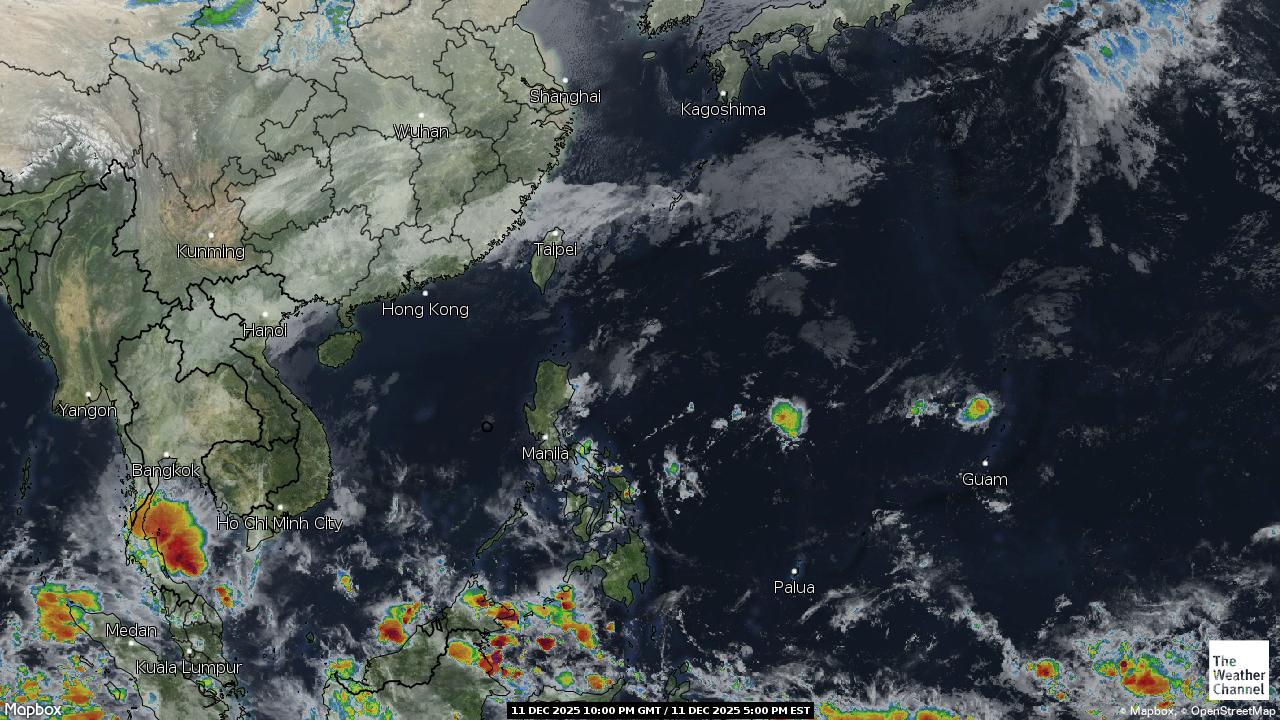 - 05:00 ภาพดาวเทียมย้อมสีจาก TWC แสดงกลุ่มฝนในเอเชียตะวันออกเฉียงใต้และโซนตะวันตกของมหาสมุทรแปซิฟิกเวลานี้