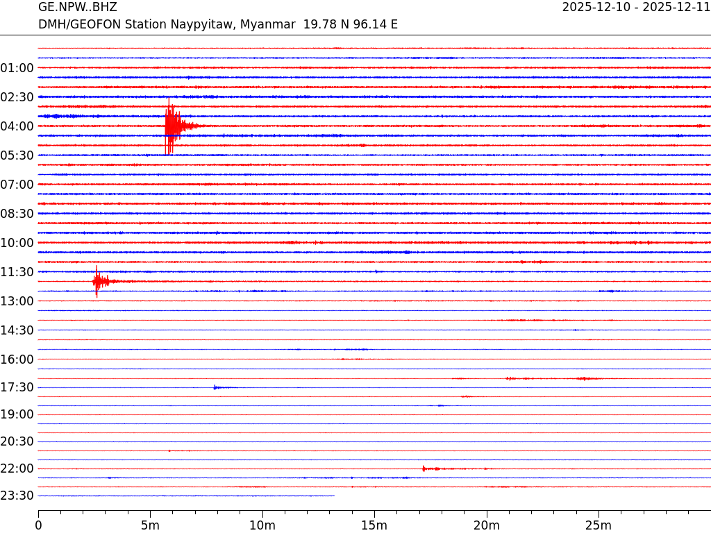 - 06:43 กราฟแผ่นดินไหว ช่วง 24 ชั่วโมงที่ผ่านมา บันทึกจากสถานีกรุงเนปิดอว์ ประเทศพม่า (กราฟนี้เน้นใช้ประโยชน์เรื่องของเวลาที่เกิดแผ่นดินไหว โดยแยกสีเป็นแดงน้ำเงินสีละครึ่งชั่วโมงเพื่อให้ดูง่าย ส่วนเรื่องขนาดแผ่นดินไหว กราฟนี้ไม่อาจใช้ระบุตัวเลขที่ชัดเจน)