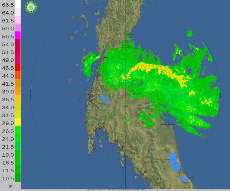 - 05:30 เรดาร์ฝน TMD แบบเคลื่อนไหว แสดงกลุ่มฝนที่ตกใน จ.สุราษฎร์ธานี ระหว่างช่วงเวลา 45 นาทีที่ผ่านมา