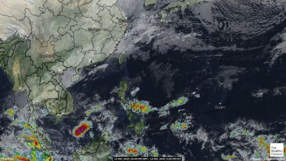 - 05:00 ภาพดาวเทียมย้อมสีจาก TWC แสดงกลุ่มฝนในเอเชียตะวันออกเฉียงใต้และโซนตะวันตกของมหาสมุทรแปซิฟิกเวลานี้