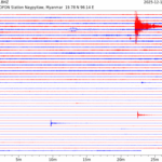 - 07:23 กราฟแผ่นดินไหว ช่วง 24 ชั่วโมงที่ผ่านมา บันทึกจากสถานีกรุงเนปิดอว์ ประเทศพม่า (กราฟนี้เน้นใช้ประโยชน์เรื่องของเวลาที่เกิดแผ่นดินไหว โดยแยกสีเป็นแดงน้ำเงินสีละครึ่งชั่วโมงเพื่อให้ดูง่าย ส่วนเรื่องขนาดแผ่นดินไหว กราฟนี้ไม่อาจใช้ระบุตัวเลขที่ชัดเจน)