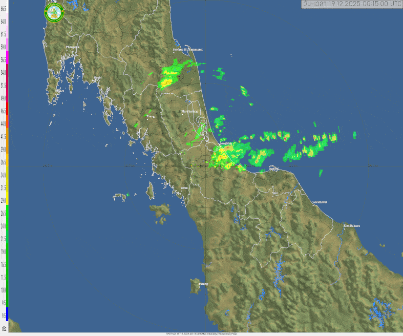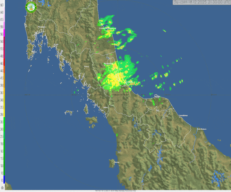- 05:45 เรดาร์ตรวจอากาศ TMD แบบเคลื่อนไหว รัศมี 240 กม. ศูนย์กลางที่ อ.หาดใหญ่ แสดงกลุ่มฝนตลอด 1 ชั่วโมง 15 นาที ที่ผ่านมา