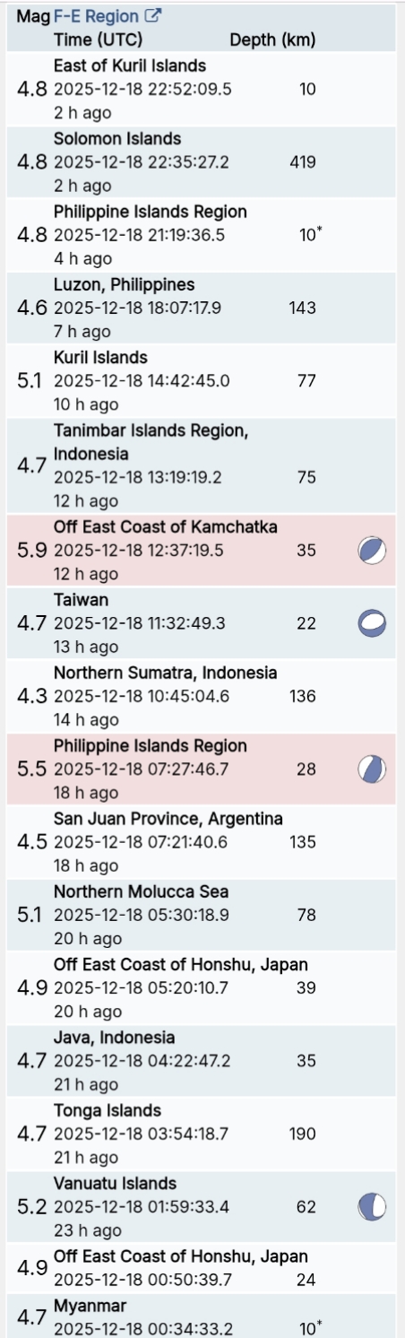 สรุปรายการแผ่นดินไหวและอาฟเตอร์ช็อกทั่วโลกจาก Geofon เยอรมนี ช่วง 07:00 เมื่อวานนี้ ถึง 07:00 เช้าวันนี้ (เวลาในตารางเป็น UTC ต้องบวก 7 ชั่วโมงให้เป็นเวลาไทย)