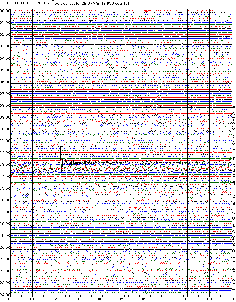 - 06:59 กราฟแผ่นดินไหวชนิดที่ใช้ดูเวลาเกิดเหตุเป็นหลัก แสดงภาพตามแนวตั้ง (BHZ) จากสถานีเครือข่าย IRIS สาขาเชียงใหม่ (CHTO) จาก 07:00 เช้าเมื่อวานนี้จนถึงเวลานี้ เส้นกราฟตามแนวนอนเส้นละ 10 นาที แยกสีเส้นกราฟเพื่อให้ดูได้ง่าย ช่องแบ่งตามแนวตั้งช่องละ 1 นาที