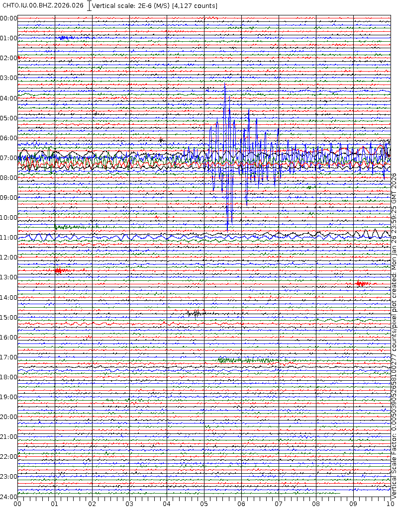- 06:58 กราฟแผ่นดินไหวชนิดที่ใช้ดูเวลาเกิดเหตุเป็นหลัก แสดงภาพตามแนวตั้ง (BHZ) จากสถานีเครือข่าย IRIS สาขาเชียงใหม่ (CHTO) จาก 07:00 เช้าเมื่อวานนี้จนถึงเวลานี้ เส้นกราฟตามแนวนอนเส้นละ 10 นาที แยกสีเส้นกราฟเพื่อให้ดูได้ง่าย ช่องแบ่งตามแนวตั้งช่องละ 1 นาที