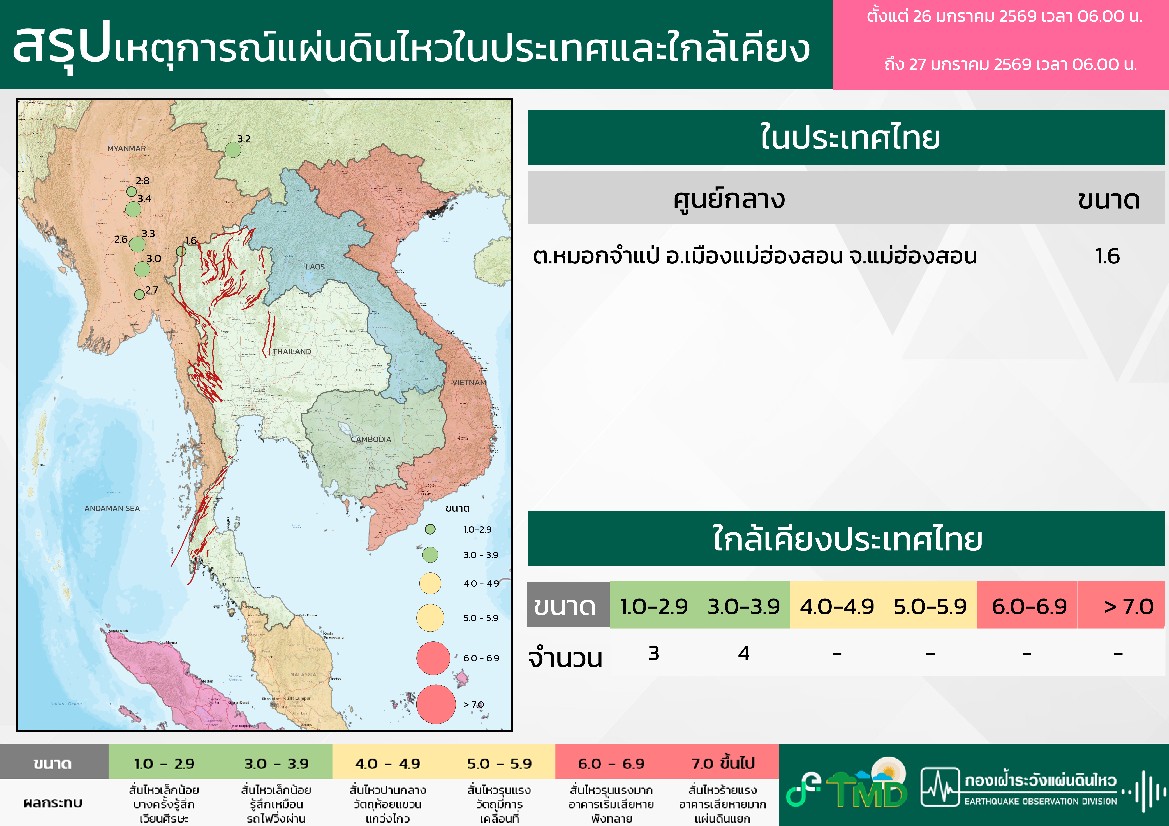- 06:00 สรุปเหตุการณ์แผ่นดินไหวในประเทศไทยและเพื่อนบ้านตลอด 24 ชั่วโมงที่ผ่านมาที่ตรวจวัดได้โดยกรมอุตุฯ