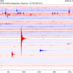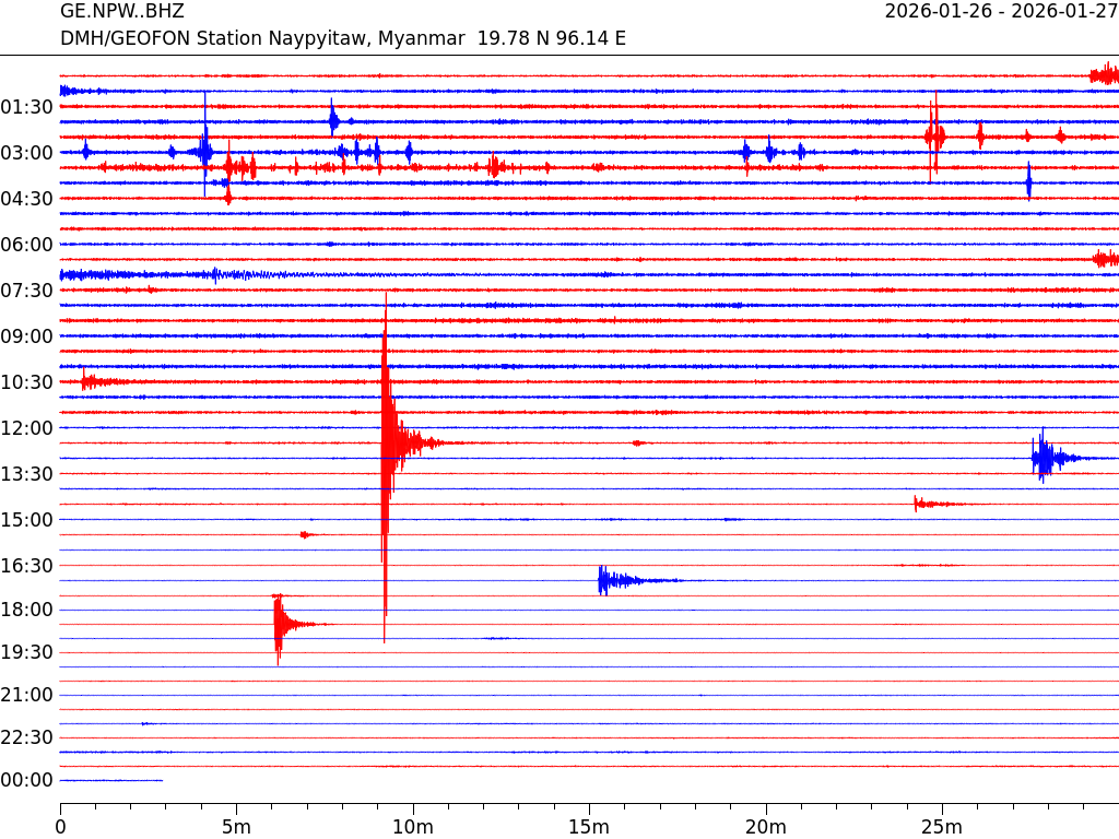 - 07:03 กราฟแผ่นดินไหว ช่วง 24 ชั่วโมงที่ผ่านมา บันทึกจากสถานีกรุงเนปิดอว์ ประเทศพม่า (กราฟนี้เน้นใช้ประโยชน์เรื่องของเวลาที่เกิดแผ่นดินไหว โดยแยกสีเป็นแดงน้ำเงินสีละครึ่งชั่วโมงเพื่อให้ดูง่าย ส่วนเรื่องขนาดแผ่นดินไหว กราฟนี้ไม่อาจใช้ระบุตัวเลขที่ชัดเจน)
