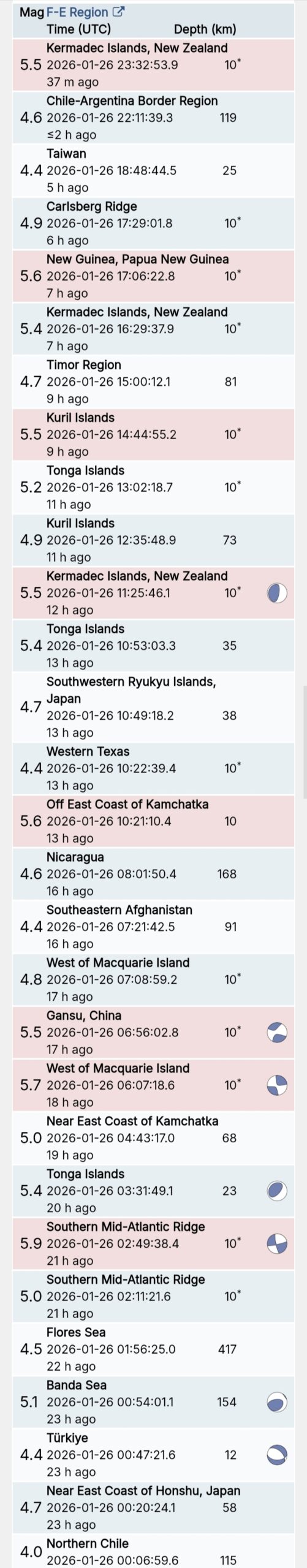 สรุปรายการแผ่นดินไหวและอาฟเตอร์ช็อกทั่วโลกจาก Geofon เยอรมนี ช่วง 07:00 เมื่อวานนี้ ถึง 07:00 เช้าวันนี้ (เวลาในตารางเป็น UTC ต้องบวก 7 ชั่วโมงให้เป็นเวลาไทย)