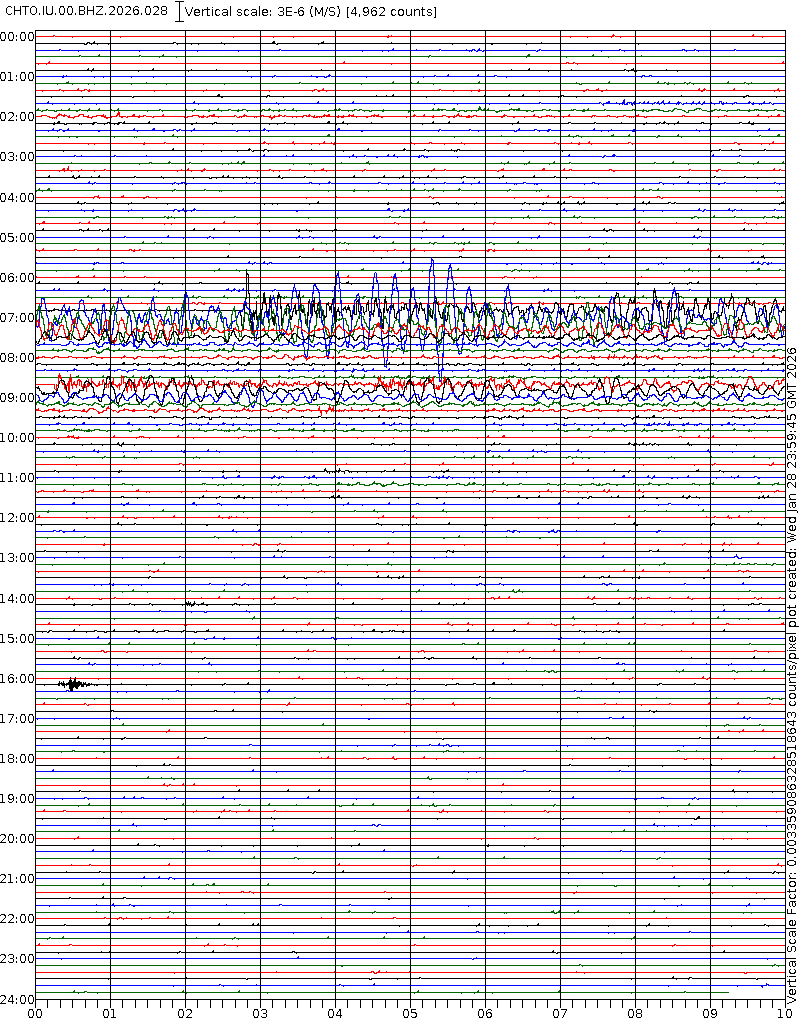 - 06:59 กราฟแผ่นดินไหวชนิดที่ใช้ดูเวลาเกิดเหตุเป็นหลัก แสดงภาพตามแนวตั้ง (BHZ) จากสถานีเครือข่าย IRIS สาขาเชียงใหม่ (CHTO) จาก 07:00 เช้าเมื่อวานนี้จนถึงเวลานี้ เส้นกราฟตามแนวนอนเส้นละ 10 นาที แยกสีเส้นกราฟเพื่อให้ดูได้ง่าย ช่องแบ่งตามแนวตั้งช่องละ 1 นาที
