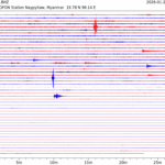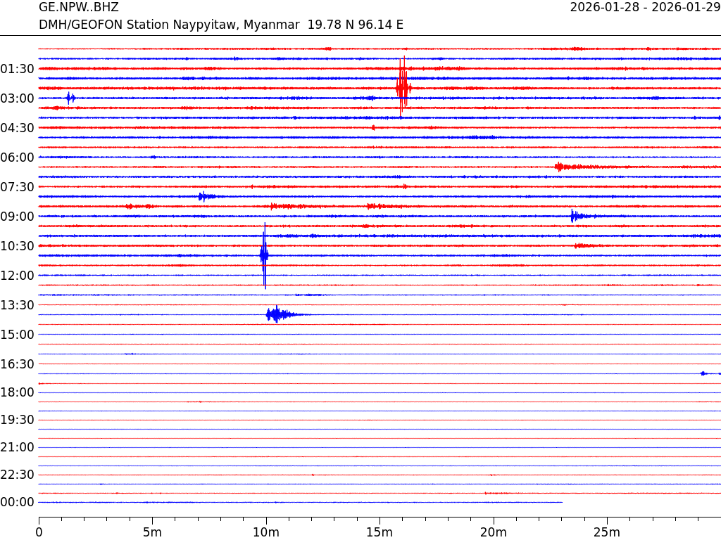 - 07:23 กราฟแผ่นดินไหว ช่วง 24 ชั่วโมงที่ผ่านมา บันทึกจากสถานีกรุงเนปิดอว์ ประเทศพม่า (กราฟนี้เน้นใช้ประโยชน์เรื่องของเวลาที่เกิดแผ่นดินไหว โดยแยกสีเป็นแดงน้ำเงินสีละครึ่งชั่วโมงเพื่อให้ดูง่าย ส่วนเรื่องขนาดแผ่นดินไหว กราฟนี้ไม่อาจใช้ระบุตัวเลขที่ชัดเจน)