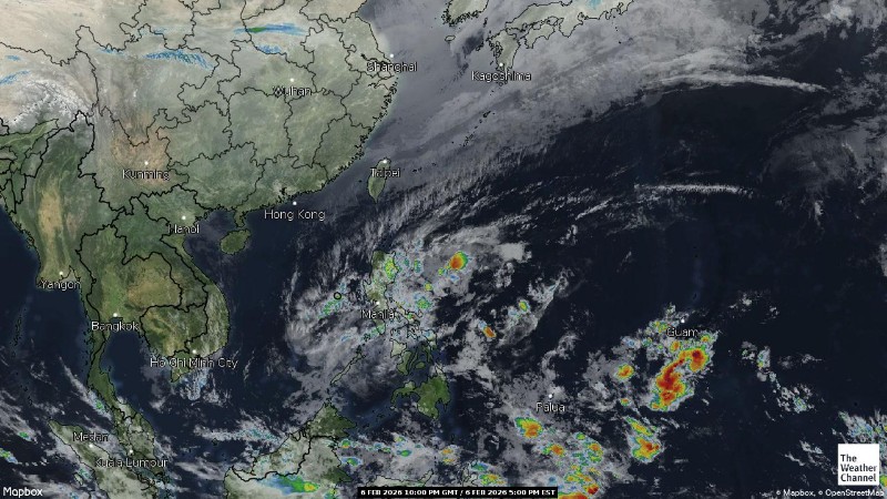 - 05:00 ภาพดาวเทียมย้อมสีจาก TWC แสดงกลุ่มฝนในเอเชียตะวันออกเฉียงใต้และโซนตะวันตกของมหาสมุทรแปซิฟิกเวลานี้