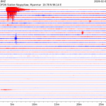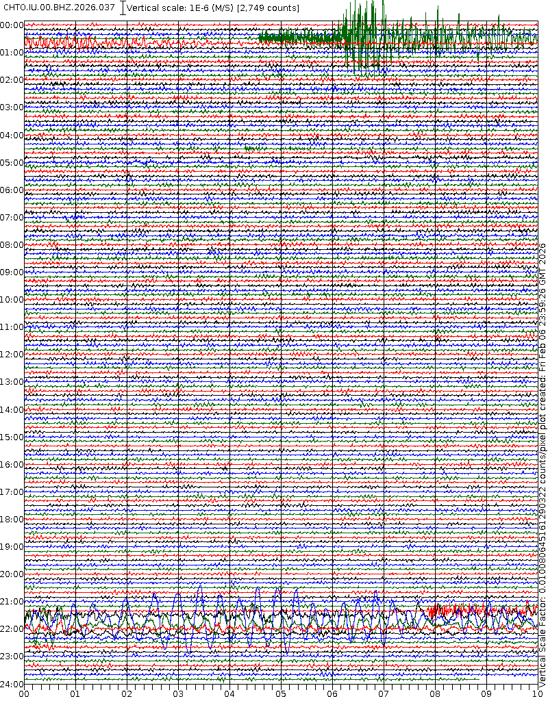 - 06:58 กราฟแผ่นดินไหวชนิดที่ใช้ดูเวลาเกิดเหตุเป็นหลัก แสดงภาพตามแนวตั้ง (BHZ) จากสถานีเครือข่าย IRIS สาขาเชียงใหม่ (CHTO) จาก 07:00 เช้าเมื่อวานนี้จนถึงเวลานี้ เส้นกราฟตามแนวนอนเส้นละ 10 นาที แยกสีเส้นกราฟเพื่อให้ดูได้ง่าย ช่องแบ่งตามแนวตั้งช่องละ 1 นาที