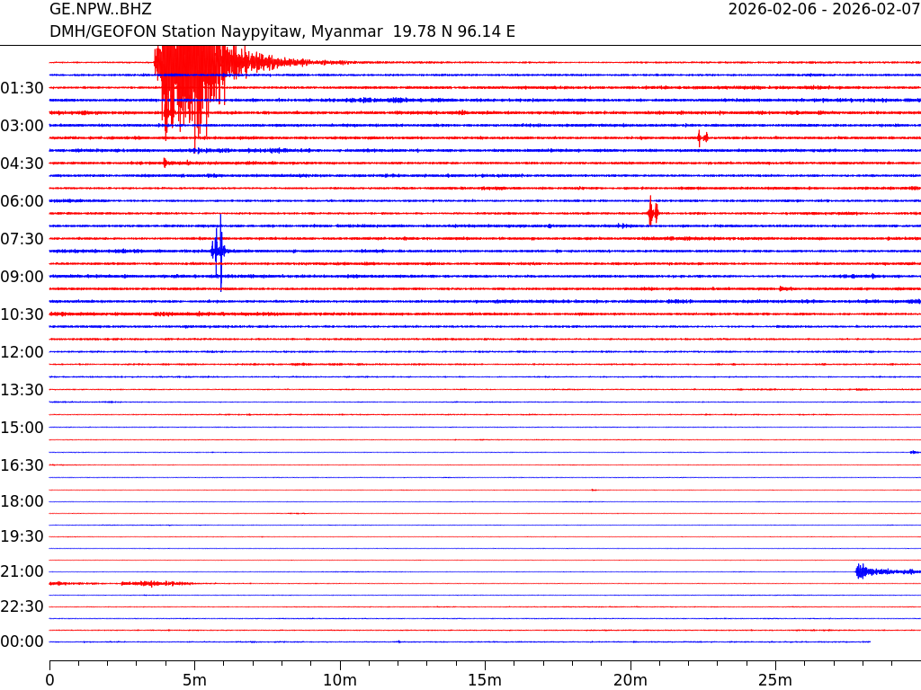 - 07:28 กราฟแผ่นดินไหว ช่วง 24 ชั่วโมงที่ผ่านมา บันทึกจากสถานีกรุงเนปิดอว์ ประเทศพม่า (กราฟนี้เน้นใช้ประโยชน์เรื่องของเวลาที่เกิดแผ่นดินไหว โดยแยกสีเป็นแดงน้ำเงินสีละครึ่งชั่วโมงเพื่อให้ดูง่าย ส่วนเรื่องขนาดแผ่นดิน