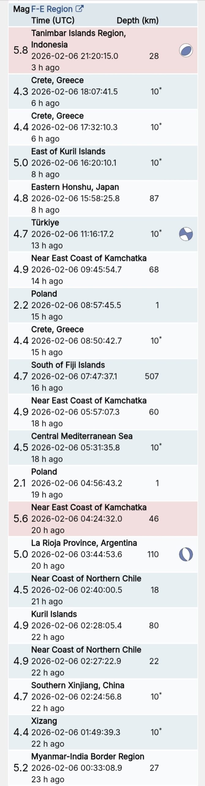 สรุปรายการแผ่นดินไหวและอาฟเตอร์ช็อกทั่วโลกจาก Geofon เยอรมนี ช่วง 07:00 เมื่อวานนี้ ถึง 07:00 เช้าวันนี้ (เวลาในตารางเป็น UTC ต้องบวก 7 ชั่วโมงให้เป็นเวลาไทย)