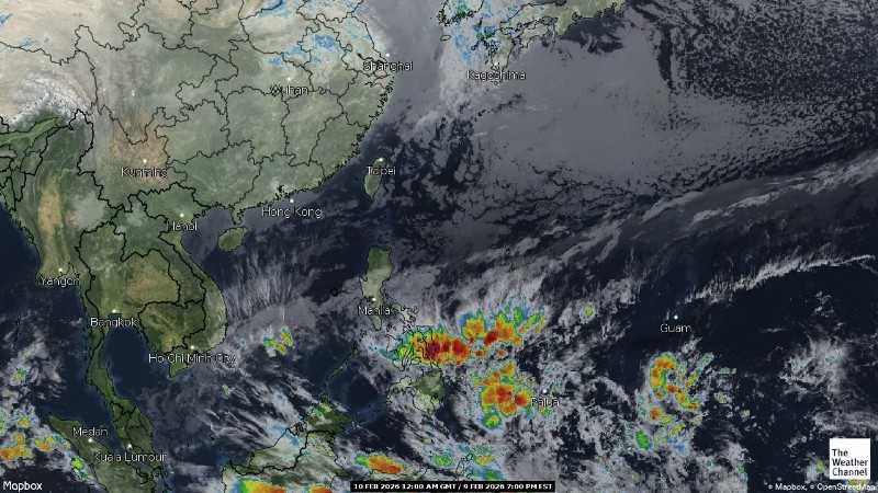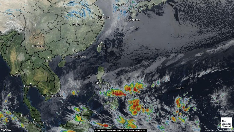 - 05:00 ภาพดาวเทียมย้อมสีจาก TWC แสดงกลุ่มฝนในเอเชียตะวันออกเฉียงใต้และโซนตะวันตกของมหาสมุทรแปซิฟิกเวลานี้