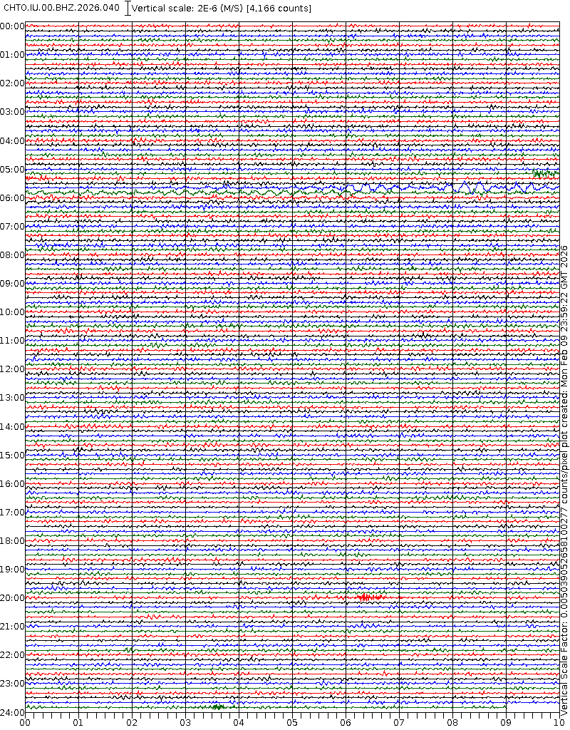 - 06:59 กราฟแผ่นดินไหวชนิดที่ใช้ดูเวลาเกิดเหตุเป็นหลัก แสดงภาพตามแนวตั้ง (BHZ) จากสถานีเครือข่าย IRIS สาขาเชียงใหม่ (CHTO) จาก 07:00 เช้าเมื่อวานนี้จนถึงเวลานี้ เส้นกราฟตามแนวนอนเส้นละ 10 นาที แยกสีเส้นกราฟเพื่อให้ดูได้ง่าย ช่องแบ่งตามแนวตั้งช่องละ 1 นาที
