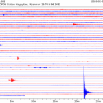 - 07:38 กราฟแผ่นดินไหว ช่วง 24 ชั่วโมงที่ผ่านมา บันทึกจากสถานีกรุงเนปิดอว์ ประเทศพม่า (กราฟนี้เน้นใช้ประโยชน์เรื่องของเวลาที่เกิดแผ่นดินไหว โดยแยกสีเป็นแดงน้ำเงินสีละครึ่งชั่วโมงเพื่อให้ดูง่าย ส่วนเรื่องขนาดแผ่นดินไหว กราฟนี้ไม่อาจใช้ระบุตัวเลขที่ชัดเจน)