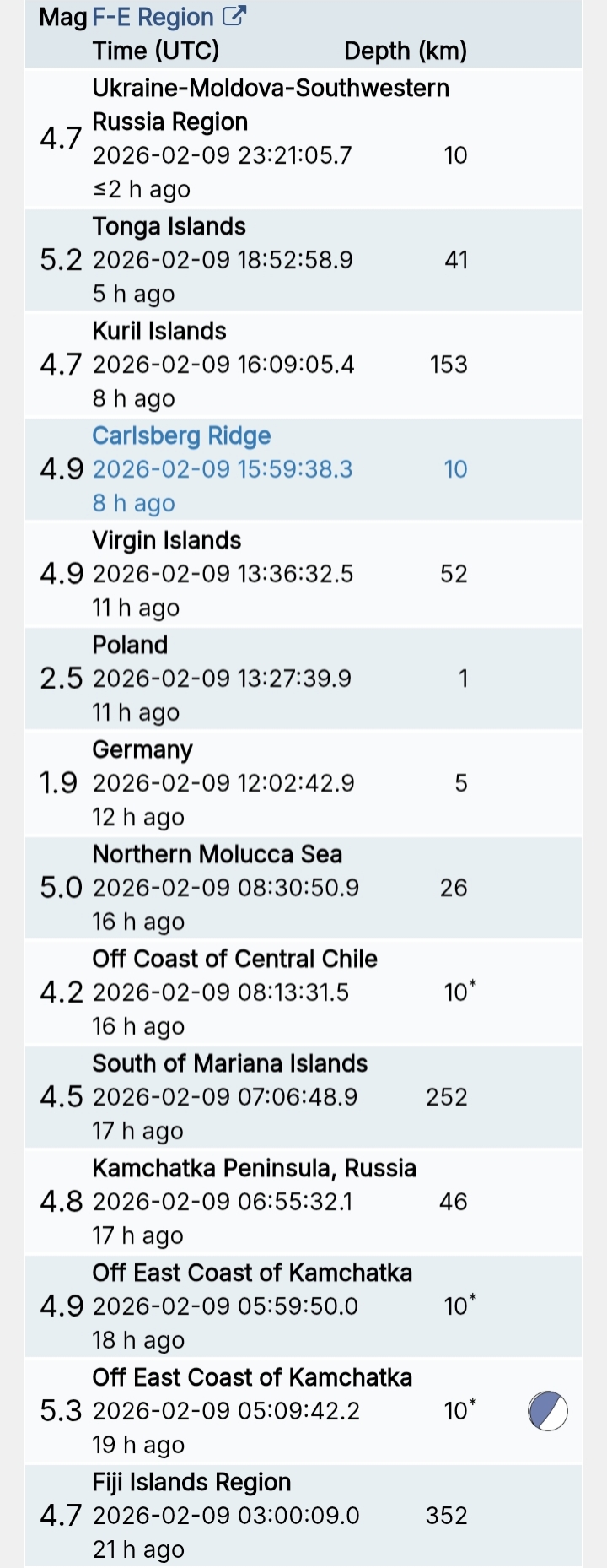 สรุปรายการแผ่นดินไหวและอาฟเตอร์ช็อกทั่วโลกจาก Geofon เยอรมนี ช่วง 07:00 เมื่อวานนี้ ถึง 07:00 เช้าวันนี้ (เวลาในตารางเป็น UTC ต้องบวก 7 ชั่วโมงให้เป็นเวลาไทย)