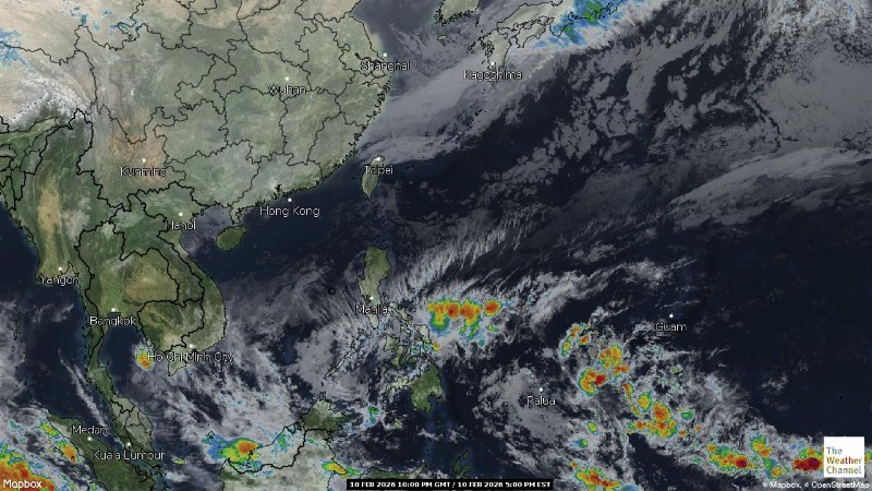 - 05:00 ภาพดาวเทียมย้อมสีจาก TWC แสดงกลุ่มฝนในเอเชียตะวันออกเฉียงใต้และโซนตะวันตกของมหาสมุทรแปซิฟิกเวลานี้