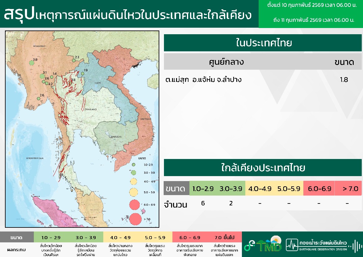 - 06:00 สรุปเหตุการณ์แผ่นดินไหวในประเทศไทยและเพื่อนบ้านตลอด 24 ชั่วโมงที่ผ่านมาที่ตรวจวัดได้โดยกรมอุตุฯ