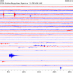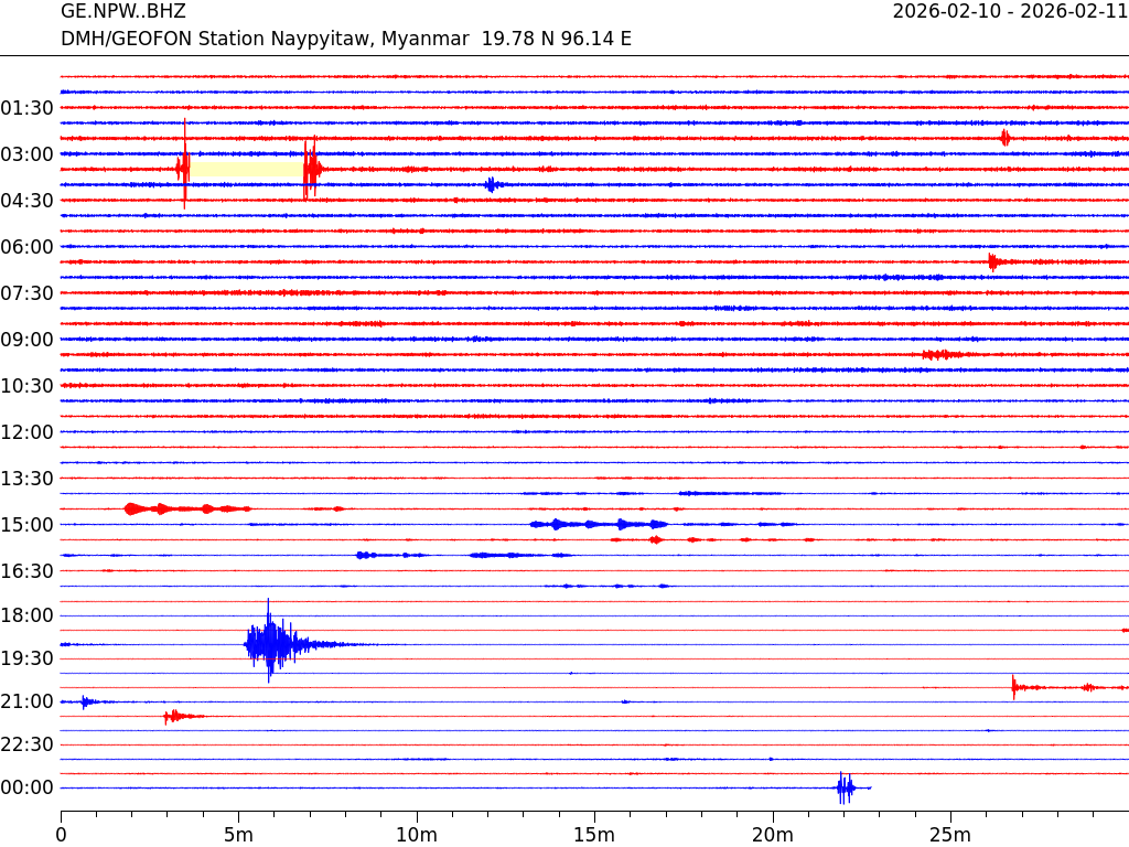- 07:22 กราฟแผ่นดินไหว ช่วง 24 ชั่วโมงที่ผ่านมา บันทึกจากสถานีกรุงเนปิดอว์ ประเทศพม่า (กราฟนี้เน้นใช้ประโยชน์เรื่องของเวลาที่เกิดแผ่นดินไหว โดยแยกสีเป็นแดงน้ำเงินสีละครึ่งชั่วโมงเพื่อให้ดูง่าย ส่วนเรื่องขนาดแผ่นดินไหว กราฟนี้ไม่อาจใช้ระบุตัวเลขที่ชัดเจน)