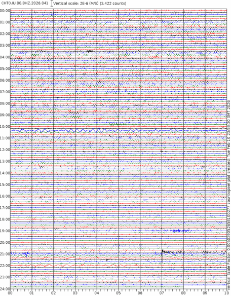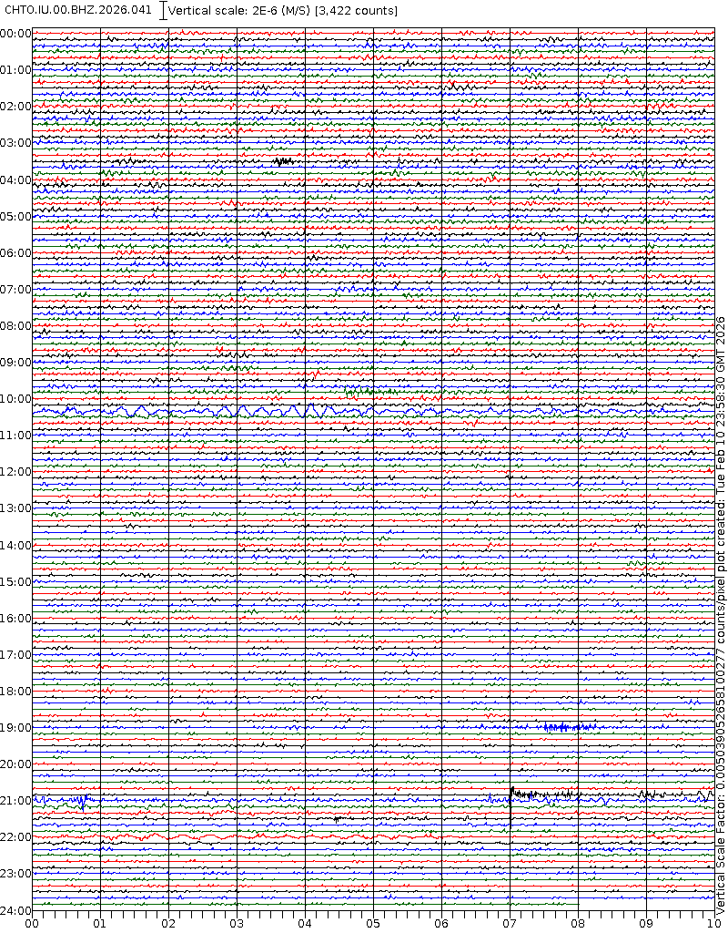- 06:58 กราฟแผ่นดินไหวชนิดที่ใช้ดูเวลาเกิดเหตุเป็นหลัก แสดงภาพตามแนวตั้ง (BHZ) จากสถานีเครือข่าย IRIS สาขาเชียงใหม่ (CHTO) จาก 07:00 เช้าเมื่อวานนี้จนถึงเวลานี้ เส้นกราฟตามแนวนอนเส้นละ 10 นาที แยกสีเส้นกราฟเพื่อให้ดูได้ง่าย ช่องแบ่งตามแนวตั้งช่องละ 1 นาที