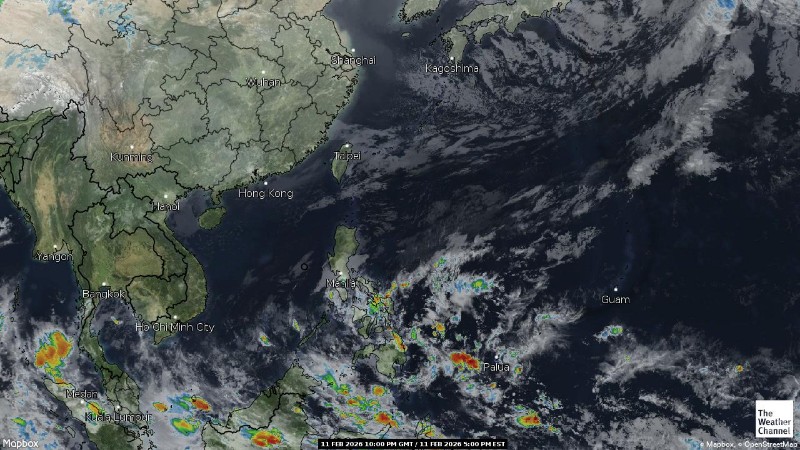 - 05:00 ภาพดาวเทียมย้อมสีจาก TWC แสดงกลุ่มฝนในเอเชียตะวันออกเฉียงใต้และโซนตะวันตกของมหาสมุทรแปซิฟิกเวลานี้