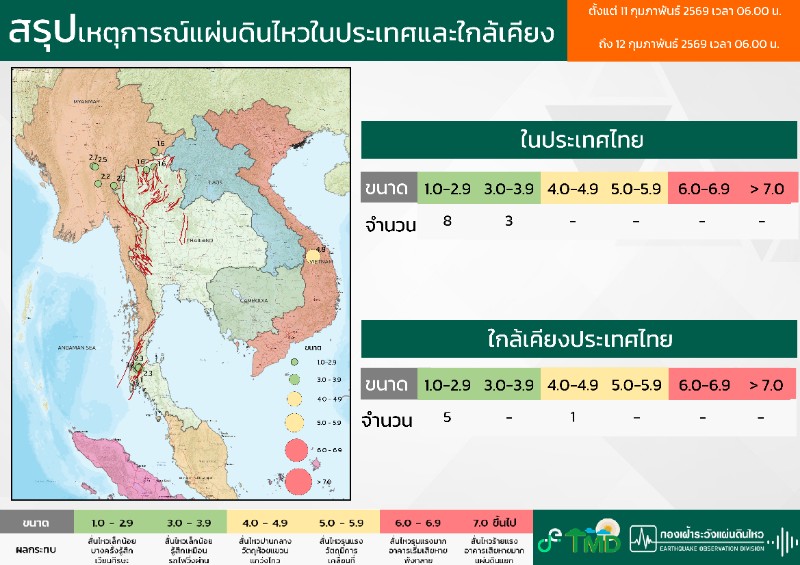 - 06:00 สรุปเหตุการณ์แผ่นดินไหวในประเทศไทยและเพื่อนบ้านตลอด 24 ชั่วโมงที่ผ่านมาที่ตรวจวัดได้โดยกรมอุตุฯ