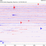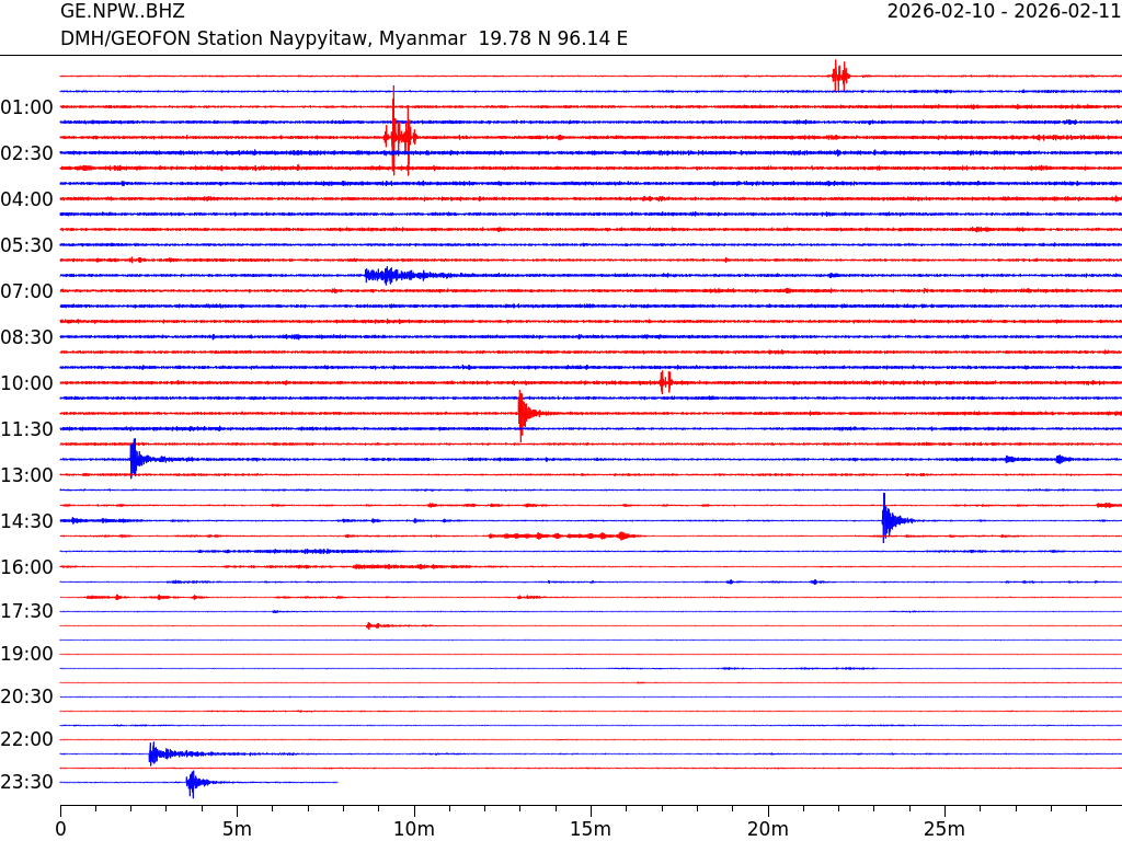 - 06:37 กราฟแผ่นดินไหว ช่วง 24 ชั่วโมงที่ผ่านมา บันทึกจากสถานีกรุงเนปิดอว์ ประเทศพม่า (กราฟนี้เน้นใช้ประโยชน์เรื่องของเวลาที่เกิดแผ่นดินไหว โดยแยกสีเป็นแดงน้ำเงินสีละครึ่งชั่วโมงเพื่อให้ดูง่าย ส่วนเรื่องขนาดแผ่นดินไหว กราฟนี้ไม่อาจใช้ระบุตัวเลขที่ชัดเจน)