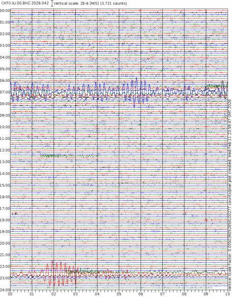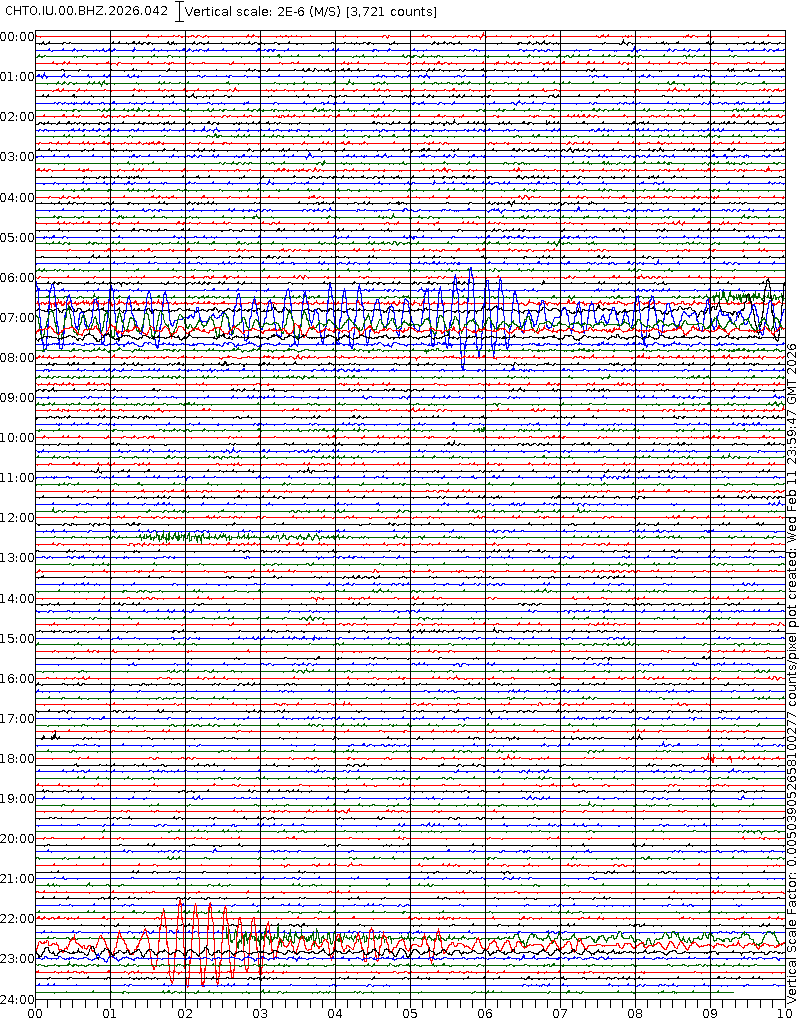 - 06:59 กราฟแผ่นดินไหวชนิดที่ใช้ดูเวลาเกิดเหตุเป็นหลัก แสดงภาพตามแนวตั้ง (BHZ) จากสถานีเครือข่าย IRIS สาขาเชียงใหม่ (CHTO) จาก 07:00 เช้าเมื่อวานนี้จนถึงเวลานี้ เส้นกราฟตามแนวนอนเส้นละ 10 นาที แยกสีเส้นกราฟเพื่อให้ดูได้ง่าย ช่องแบ่งตามแนวตั้งช่องละ 1 นาที