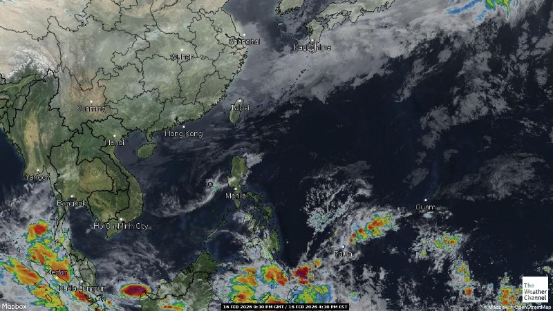 - 04:30 ภาพดาวเทียมย้อมสีจาก TWC แสดงกลุ่มฝนในเอเชียตะวันออกเฉียงใต้และโซนตะวันตกของมหาสมุทรแปซิฟิกเวลานี้