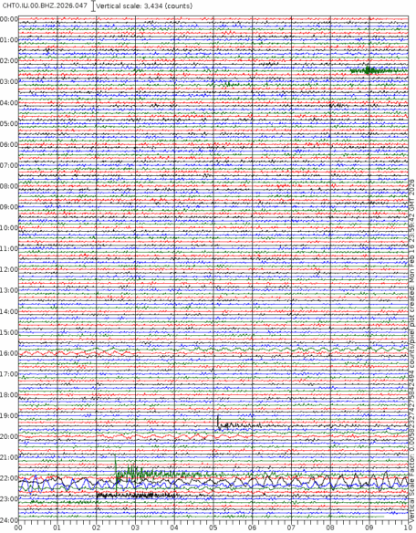 - 06:59 กราฟแผ่นดินไหวชนิดที่ใช้ดูเวลาเกิดเหตุเป็นหลัก แสดงภาพตามแนวตั้ง (BHZ) จากสถานีเครือข่าย IRIS สาขาเชียงใหม่ (CHTO) จาก 07:00 เช้าเมื่อวานนี้จนถึงเวลานี้ เส้นกราฟตามแนวนอนเส้นละ 10 นาที แยกสีเส้นกราฟเพื่อให้ดูได้ง่าย ช่องแบ่งตามแนวตั้งช่องละ 1 นาที