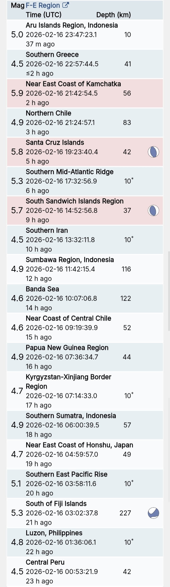 สรุปรายการแผ่นดินไหวและอาฟเตอร์ช็อกทั่วโลกจาก Geofon เยอรมนี ช่วง 07:00 เมื่อวานนี้ ถึง 07:00 เช้าวันนี้ (เวลาในตารางเป็น UTC ต้องบวก 7 ชั่วโมงให้เป็นเวลาไทย)