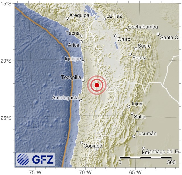 - 04:24 แผ่นดินไหวขนาด 4.9 (mb) ลึก 83 กม.พิกัด 68.85°W 22.32°S ประเทศชิลี