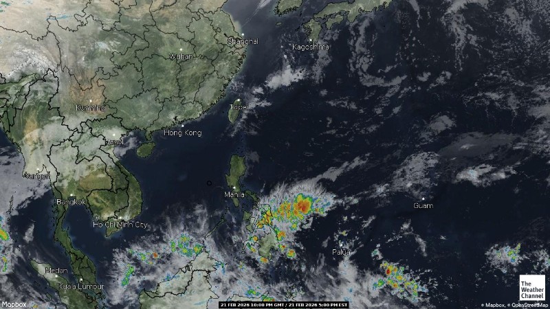 • 05:00 ภาพดาวเทียมย้อมสีจาก TWC แสดงกลุ่มฝนในเอเชียตะวันออกเฉียงใต้และโซนตะวันตกของมหาสมุทรแปซิฟิกเวลานี้