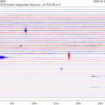 • 05:57 กราฟแผ่นดินไหว ช่วง 24 ชั่วโมงที่ผ่านมา บันทึกจากสถานีกรุงเนปิดอว์ ประเทศพม่า (กราฟนี้เน้นใช้ประโยชน์เรื่องของเวลาที่เกิดแผ่นดินไหว โดยแยกสีเป็นแดงน้ำเงินสีละครึ่งชั่วโมงเพื่อให้ดูง่าย ส่วนเรื่องขนาดแผ่นดินไหว กราฟนี้ไม่อาจใช้ระบุตัวเลขที่ชัดเจน)