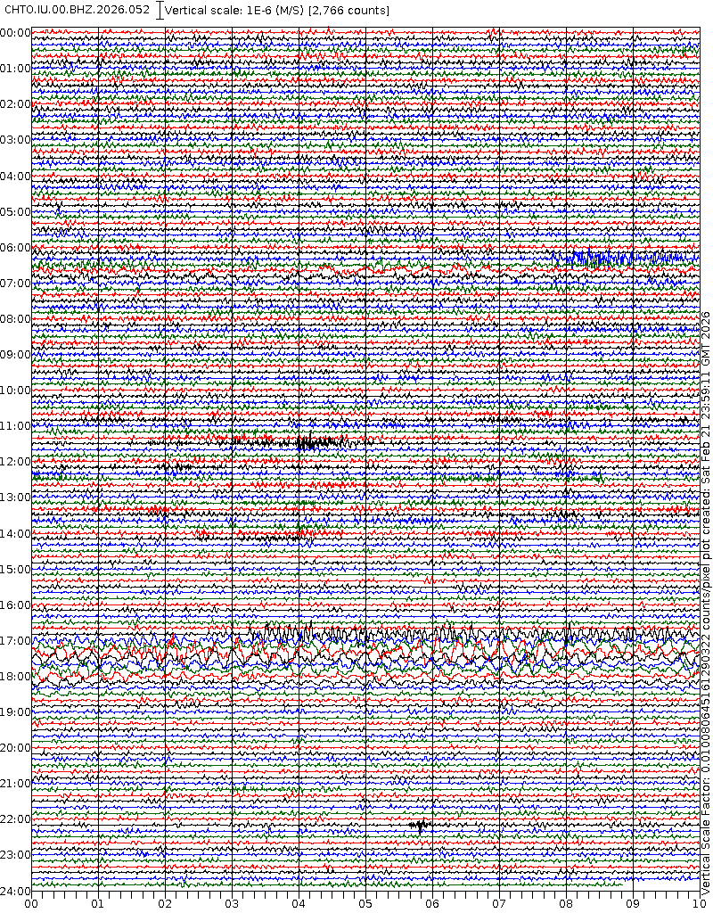 • 06:58 กราฟแผ่นดินไหวชนิดที่ใช้ดูเวลาเกิดเหตุเป็นหลัก แสดงภาพตามแนวตั้ง (BHZ) จากสถานีเครือข่าย IRIS สาขาเชียงใหม่ (CHTO) จาก 07:00 เช้าเมื่อวานนี้จนถึงเวลานี้ เส้นกราฟตามแนวนอนเส้นละ 10 นาที แยกสีเส้นกราฟเพื่อให้ดูได้ง่าย ช่องแบ่งตามแนวตั้งช่องละ 1 นาที