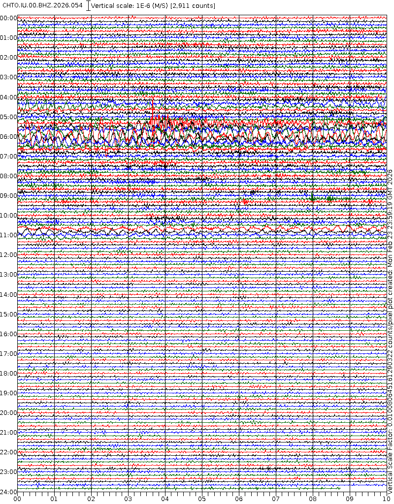 - 06:58 กราฟแผ่นดินไหวชนิดที่ใช้ดูเวลาเกิดเหตุเป็นหลัก แสดงภาพตามแนวตั้ง (BHZ) จากสถานีเครือข่าย IRIS สาขาเชียงใหม่ (CHTO) จาก 07:00 เช้าเมื่อวานนี้จนถึงเวลานี้ เส้นกราฟตามแนวนอนเส้นละ 10 นาที แยกสีเส้นกราฟเพื่อให้ดูได้ง่าย ช่องแบ่งตามแนวตั้งช่องละ 1 นาที