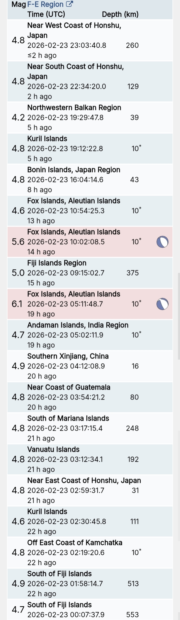 สรุปรายการแผ่นดินไหวและอาฟเตอร์ช็อกทั่วโลกจาก Geofon เยอรมนี ช่วง 07:00 เมื่อวานนี้ ถึง 07:00 เช้าวันนี้ (เวลาในตารางเป็น UTC ต้องบวก 7 ชั่วโมงให้เป็นเวลาไทย)