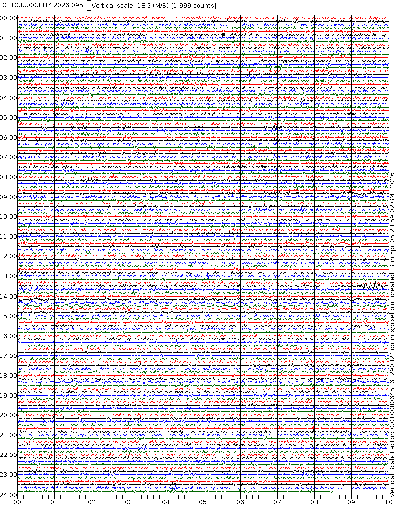 - 06:58 กราฟแผ่นดินไหวชนิดที่ใช้ดูเวลาเกิดเหตุเป็นหลัก แสดงภาพตามแนวตั้ง (BHZ) จากสถานีเครือข่าย IRIS สาขาเชียงใหม่ (CHTO) จาก 07:00 เช้าเมื่อวานนี้จนถึงเวลานี้ เส้นกราฟตามแนวนอนเส้นละ 10 นาที แยกสีเส้นกราฟเพื่อให้ดูได้ง่าย ช่องแบ่งตามแนวตั้งช่องละ 1 นาที