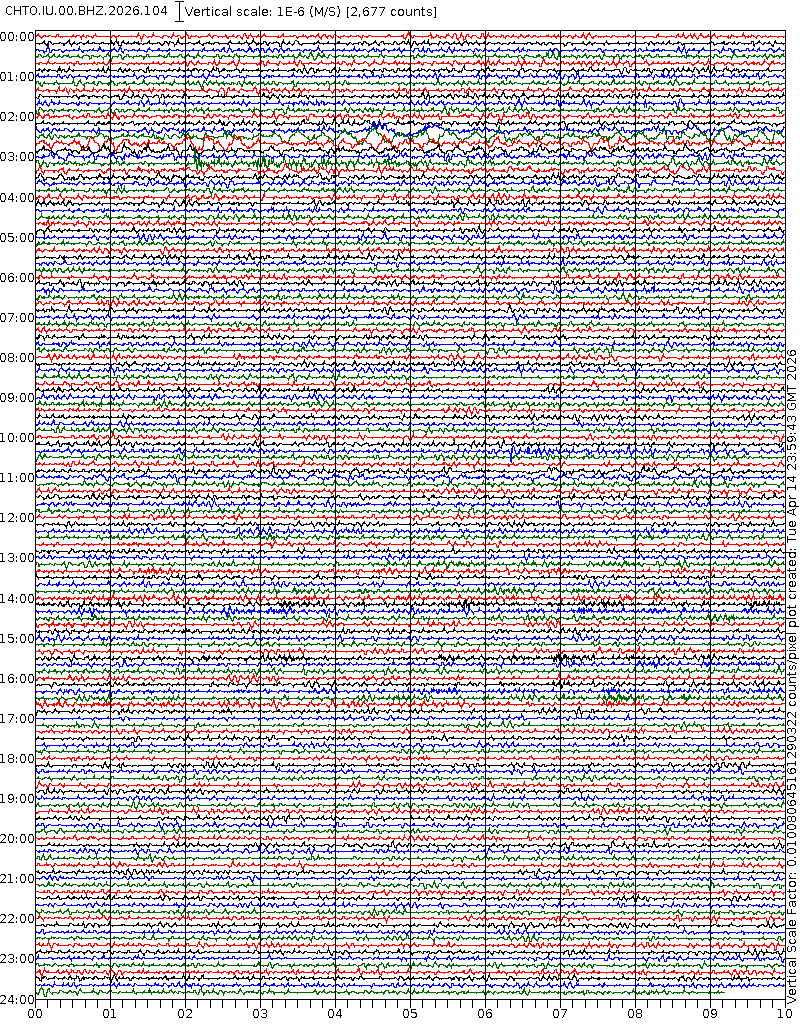 - 06:59 กราฟแผ่นดินไหวชนิดที่ใช้ดูเวลาเกิดเหตุเป็นหลัก แสดงภาพตามแนวตั้ง (BHZ) จากสถานีเครือข่าย IRIS สาขาเชียงใหม่ (CHTO) จาก 07:00 เช้าเมื่อวานนี้จนถึงเวลานี้ เส้นกราฟตามแนวนอนเส้นละ 10 นาที แยกสีเส้นกราฟเพื่อให้ดูได้ง่าย ช่องแบ่งตามแนวตั้งช่องละ 1 นาที