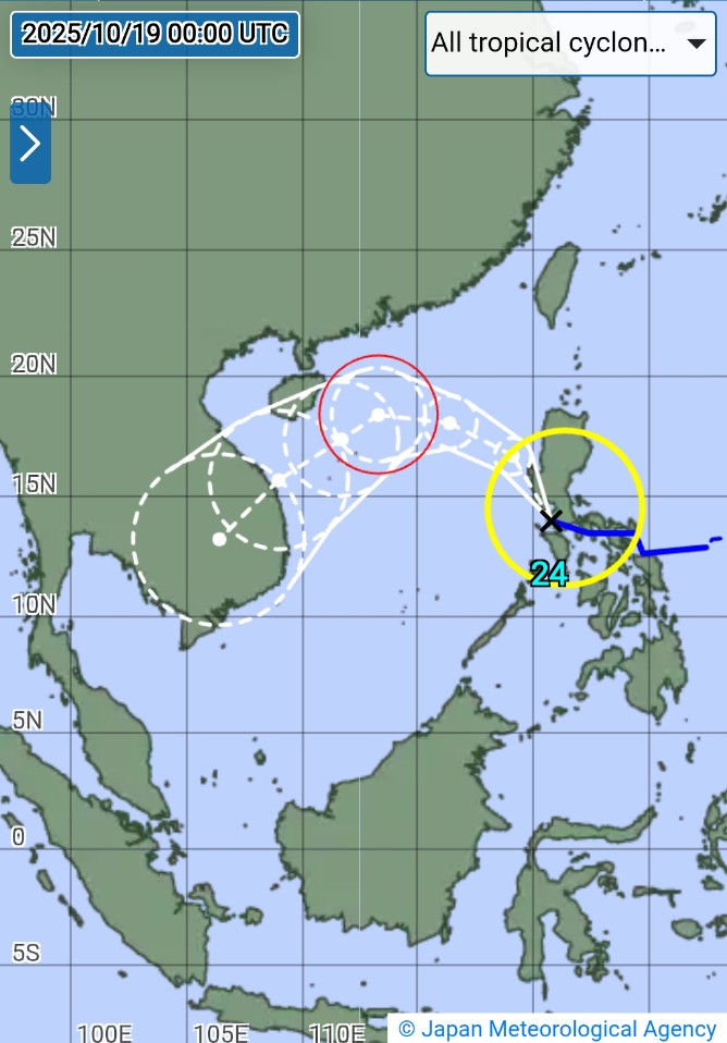 • 07:00 พายุโซนร้อน “เฟิงเฉิน”Fengshen 風神  ความเร็วลมใกล้ศูนย์กลางพายุ 35 น็อต ความกดอากาศ 1002 hPa พิกัดล่าสุดอยู่ที่ 14.0°N 120.8°E ในจังหวัดบาตังกัส แนวโน้มลงสู่ทะเลจีนใต้แล้วเคลื่อนตัวมาทางตอนกลางของเวียดนาม