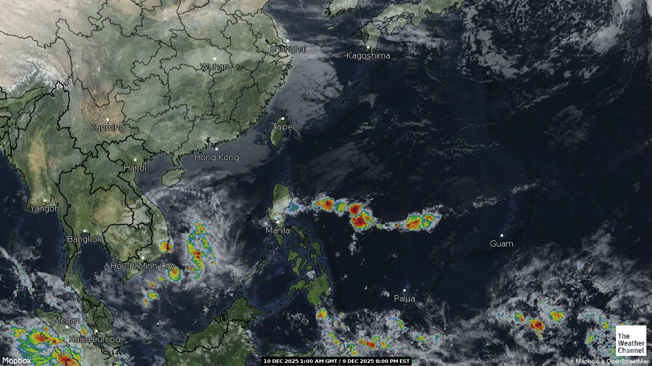 - 08:00 ภาพดาวเทียมย้อมสีจาก TWC แสดงกลุ่มฝนในเอเชียตะวันออกเฉียงใต้และโซนตะวันตกของมหาสมุทรแปซิฟิกเวลานี้
