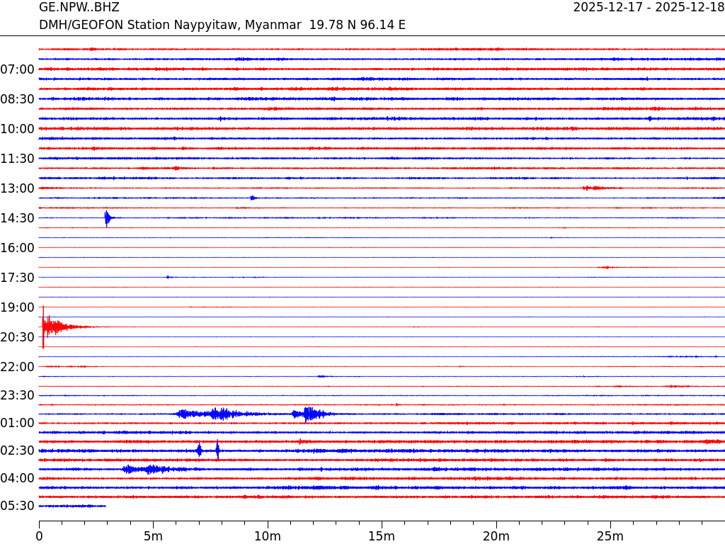 - 12:33 กราฟแผ่นดินไหว ช่วง 24 ชั่วโมงที่ผ่านมา บันทึกจากสถานีกรุงเนปิดอว์ ประเทศพม่า (กราฟนี้เน้นใช้ประโยชน์เรื่องของเวลาที่เกิดแผ่นดินไหว โดยแยกสีเป็นแดงน้ำเงินสีละครึ่งชั่วโมงเพื่อให้ดูง่าย ส่วนเรื่องขนาดแผ่นดินไหว กราฟนี้ไม่อาจใช้ระบุตัวเลขที่ชัดเจน)