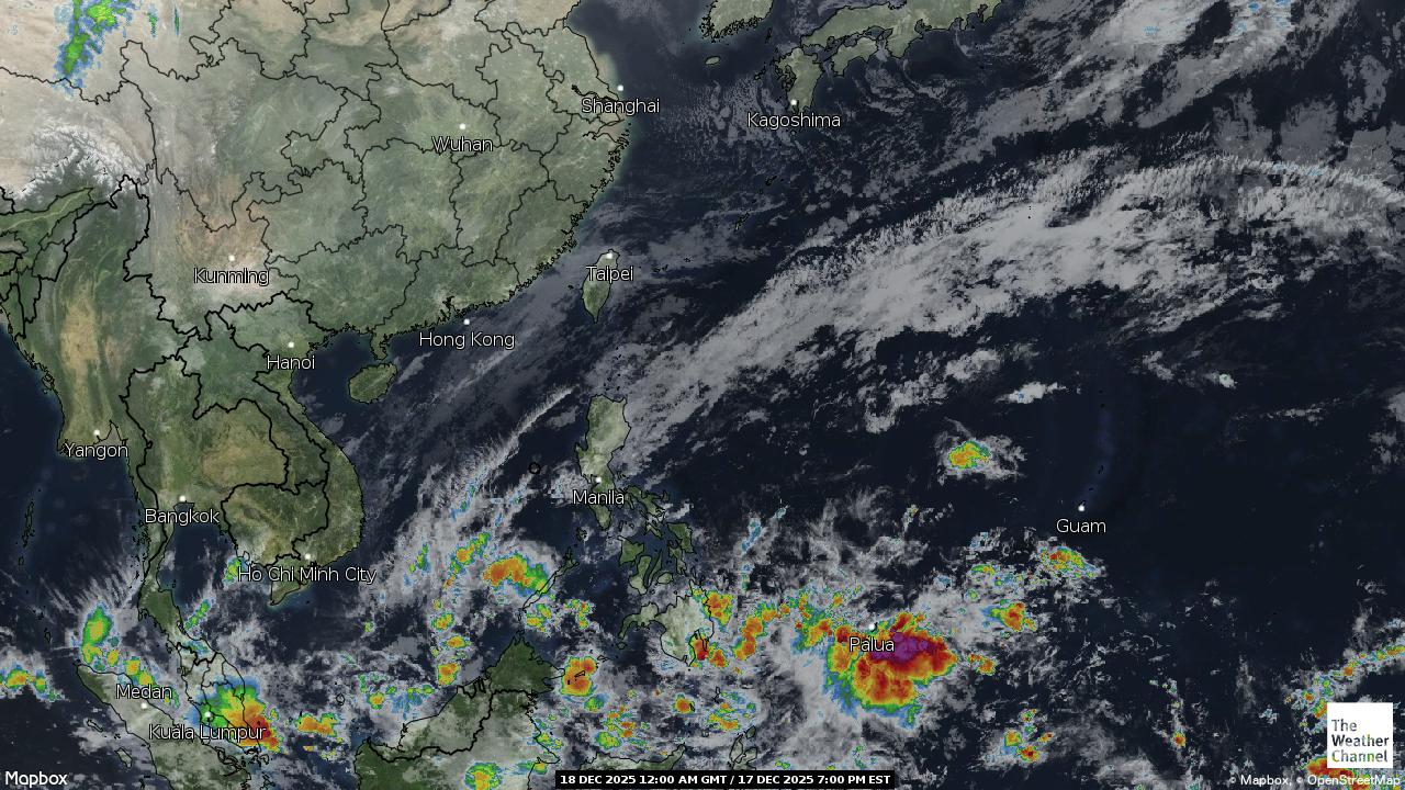 - 07:00 ภาพดาวเทียมย้อมสีจาก TWC แสดงกลุ่มฝนในเอเชียตะวันออกเฉียงใต้และโซนตะวันตกของมหาสมุทรแปซิฟิกเวลานี้
