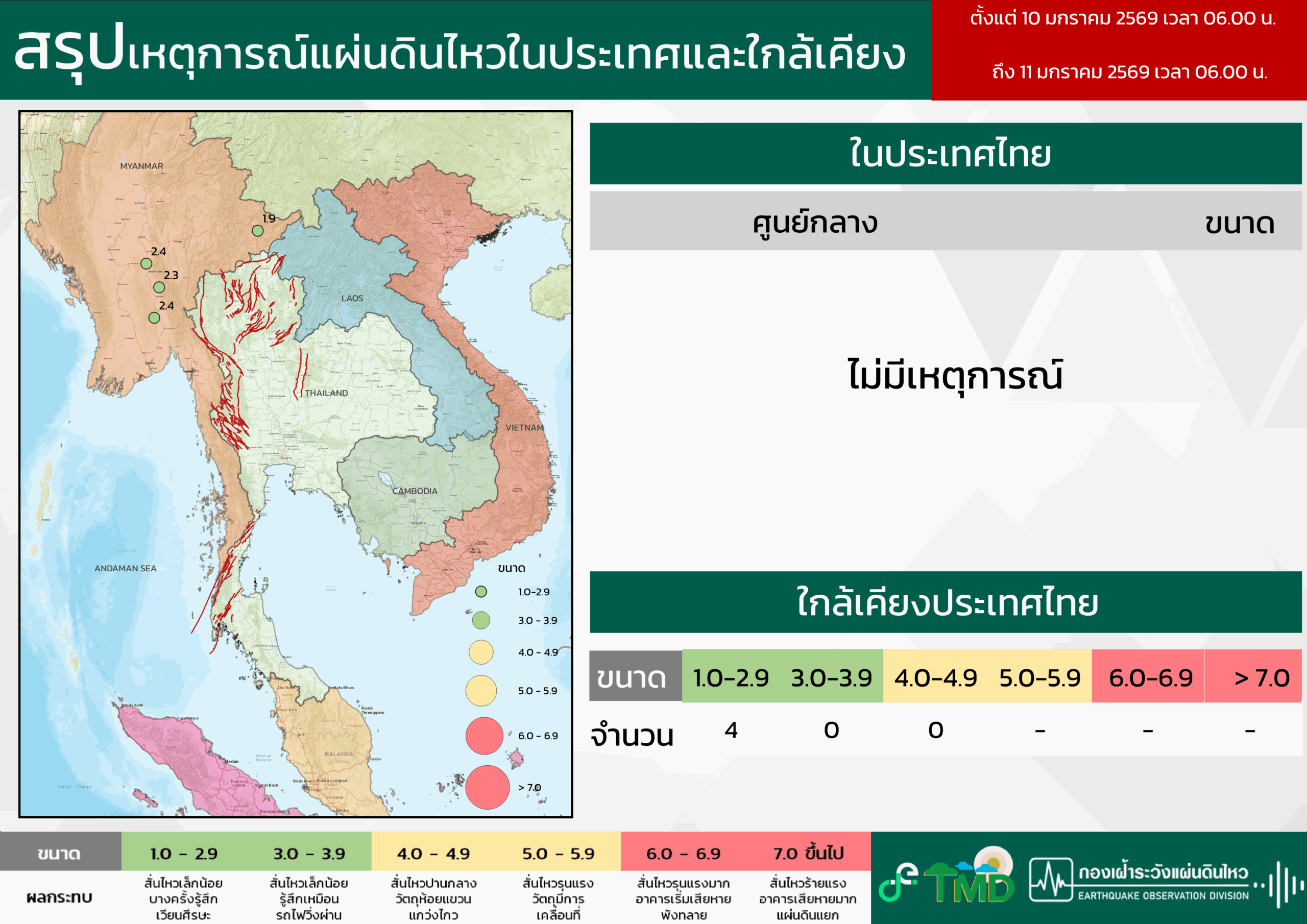 • 06:00 สรุปเหตุการณ์แผ่นดินไหวในประเทศไทยและเพื่อนบ้านตลอด 24 ชั่วโมงที่ผ่านมาที่ตรวจวัดได้โดยกรมอุตุฯ