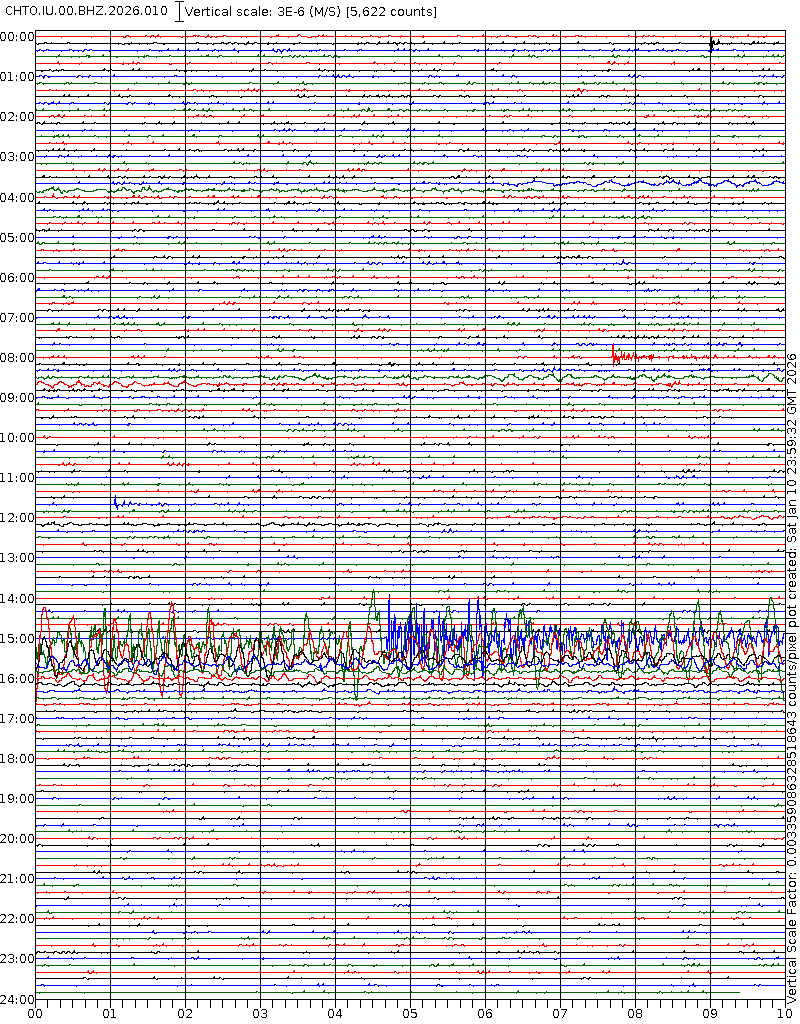 • 06:59 กราฟแผ่นดินไหวชนิดที่ใช้ดูเวลาเกิดเหตุเป็นหลัก แสดงภาพตามแนวตั้ง (BHZ) จากสถานีเครือข่าย IRIS สาขาเชียงใหม่ (CHTO) จาก 07:00 เช้าเมื่อวานนี้จนถึงเวลานี้ เส้นกราฟตามแนวนอนเส้นละ 10 นาที แยกสีเส้นกราฟเพื่อให้ดูได้ง่าย ช่องแบ่งตามแนวตั้งช่องละ 1 นาที