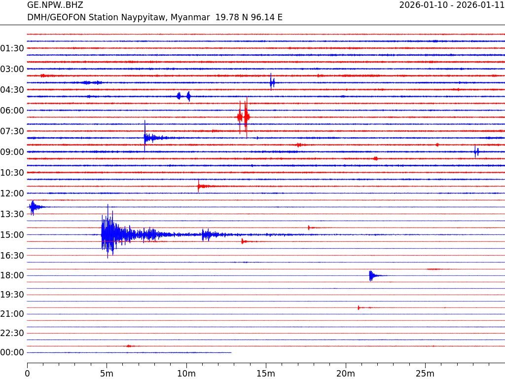 • 07:14 กราฟแผ่นดินไหว ช่วง 24 ชั่วโมงที่ผ่านมา บันทึกจากสถานีกรุงเนปิดอว์ ประเทศพม่า (กราฟนี้เน้นใช้ประโยชน์เรื่องของเวลาที่เกิดแผ่นดินไหว โดยแยกสีเป็นแดงน้ำเงินสีละครึ่งชั่วโมงเพื่อให้ดูง่าย ส่วนเรื่องขนาดแผ่นดินไหว กราฟนี้ไม่อาจใช้ระบุตัวเลขที่ชัดเจน)