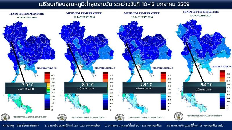 - 07:00 แผนที่เปรียบเทียบอุณหภูมิต่ำสุดในประเทศไทยรอบ 24 ชั่วโมงย้อนหลัง 4 วัน